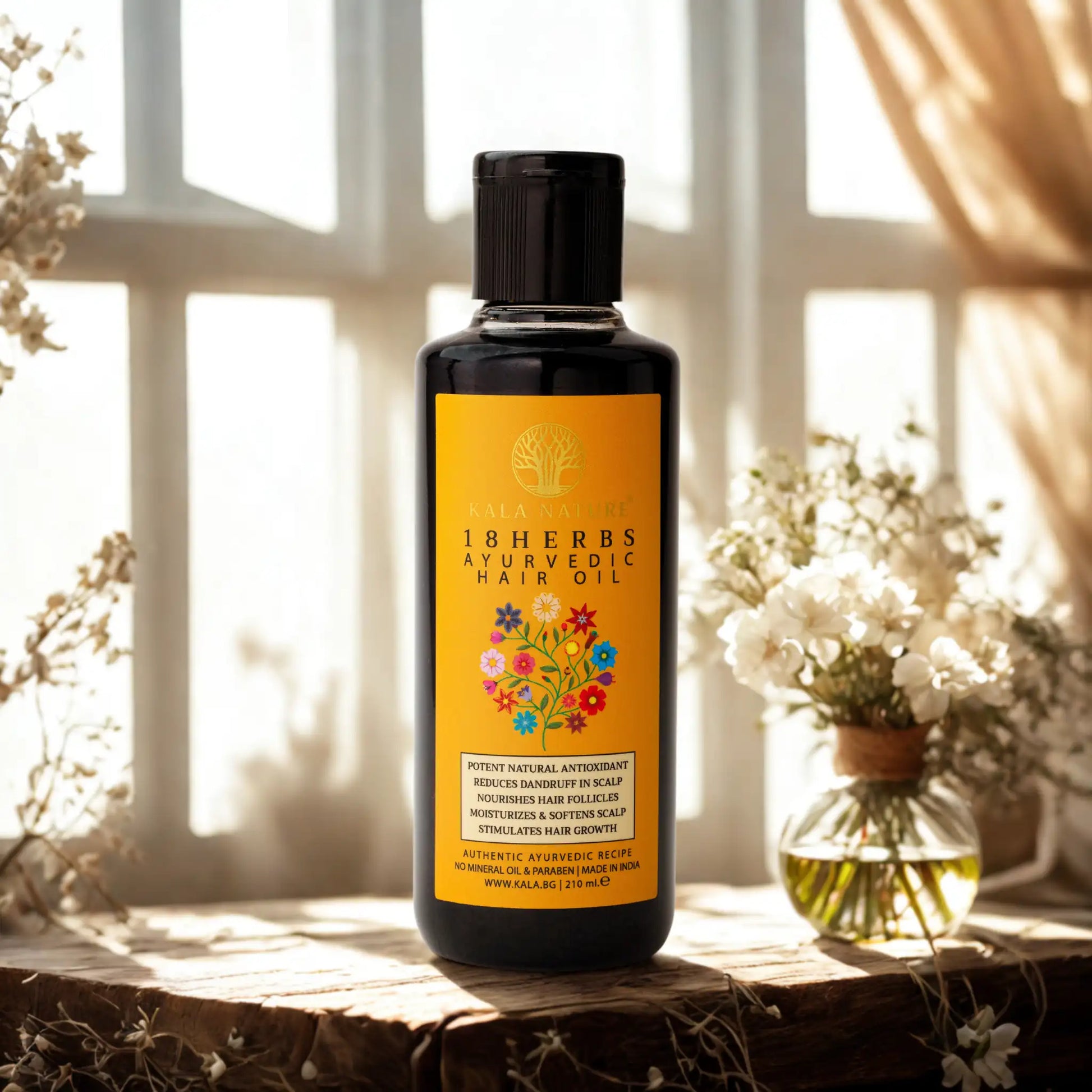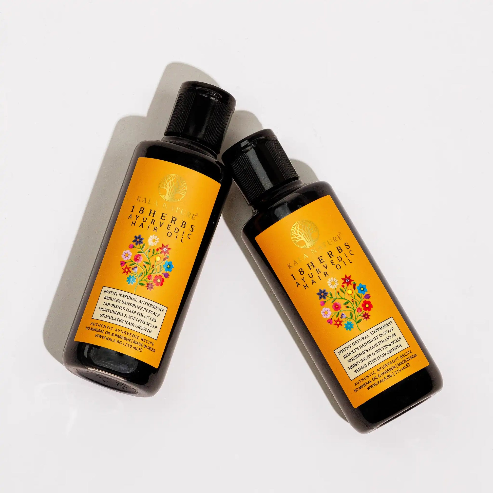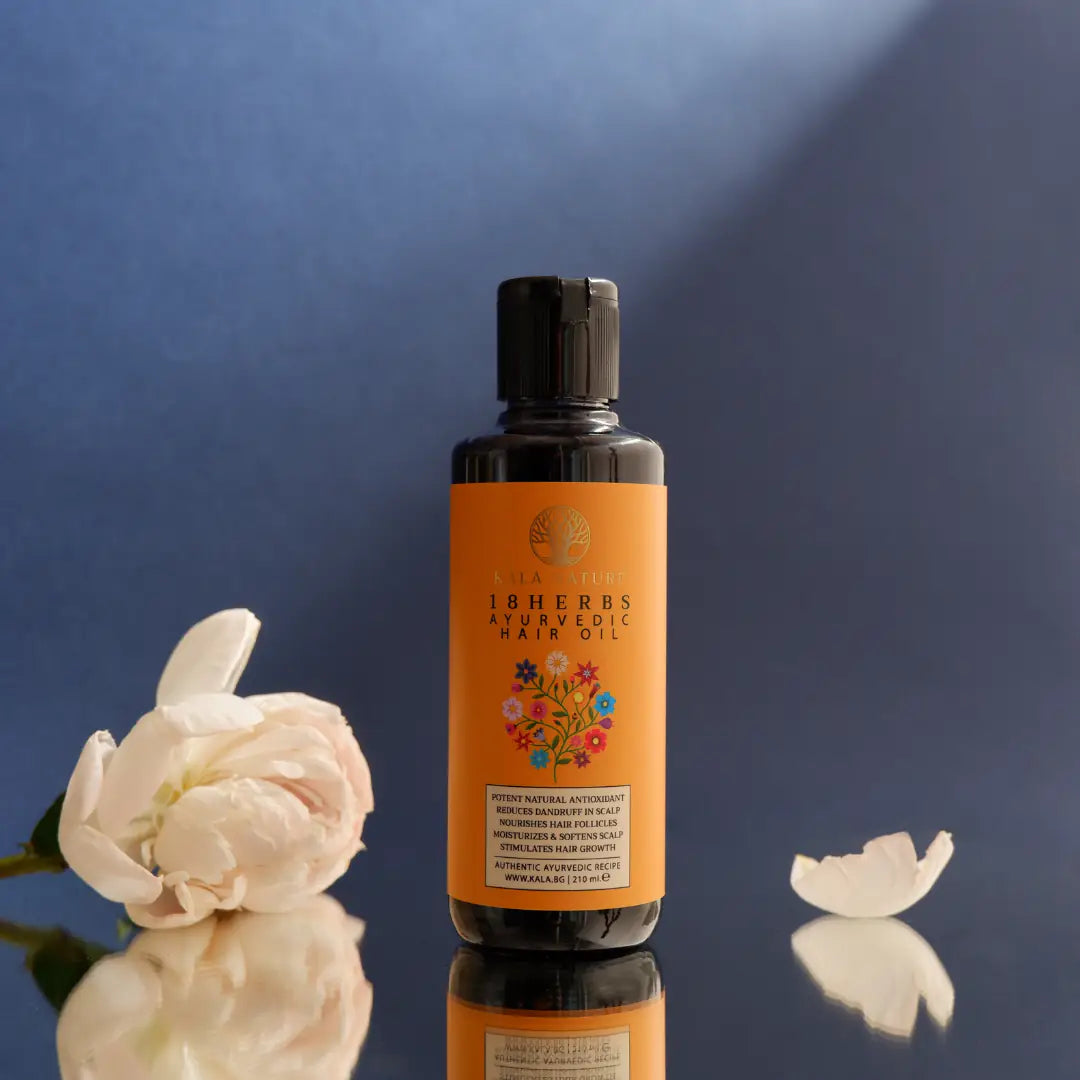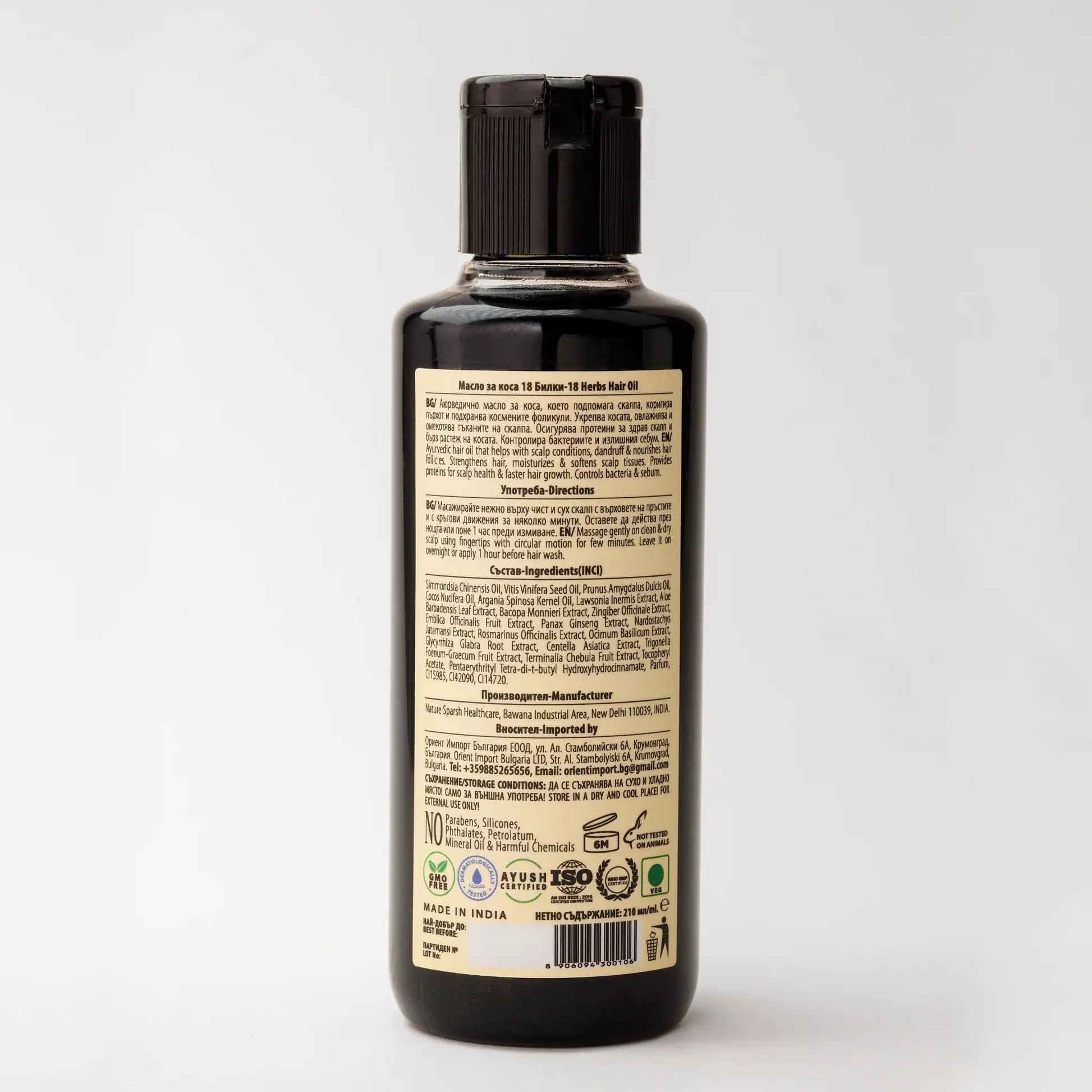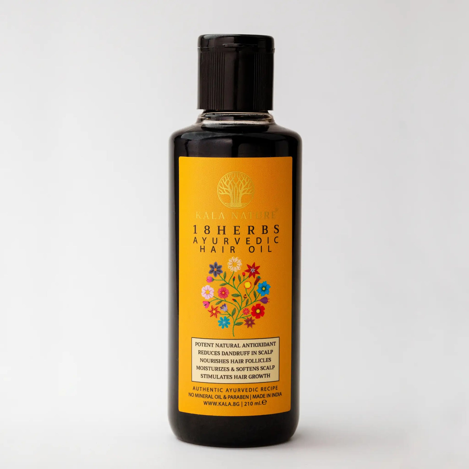 Нашето аюрведично масло с 18 подхранващи билки хидратира, възстановява и съживява както косата, така и скалпа. То стимулира растежа, предотвратява косопад, премахва пърхота и оставя косата лека, мека и блестяща.