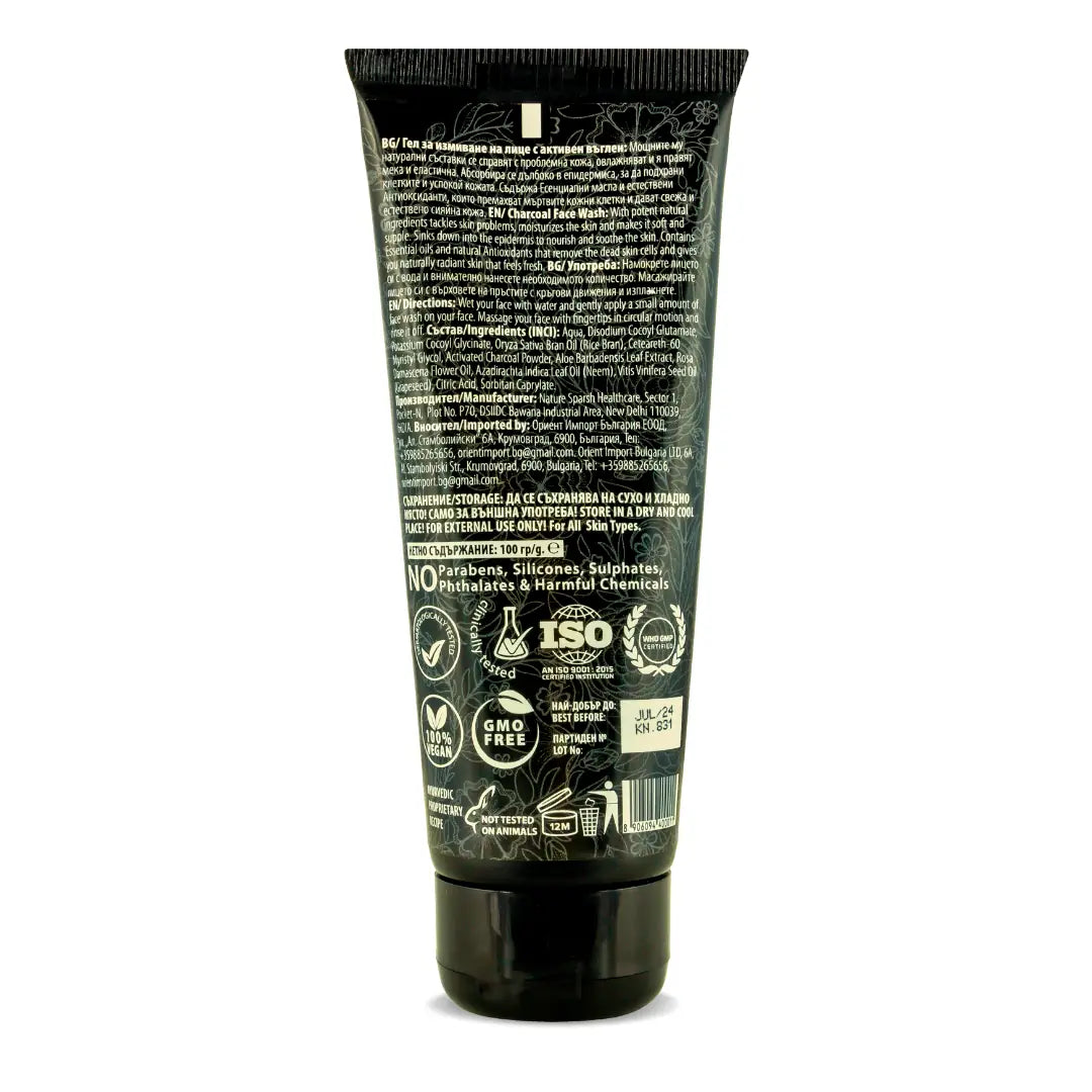 Aqua, Disodium Cocoyl Glutamate, Potassium Cocoyl Glycinate, Oryza Sativa Bran Oil (Оризови трици), Ceteareth-60 Myristyl Glycol, Activated Charcoal Powder (Бамбуков въглен), Aloe Barbadensis Leaf Extract (Алое), Rosa Damascena Flower Oil (Масло Дамасцена), Azadirachta Indica Leaf Oil (Масло Нийм), Vitis Vinifera Seed Oil (Масло Гроздови семки), Citric Acid, Sorbitan Caprylate.