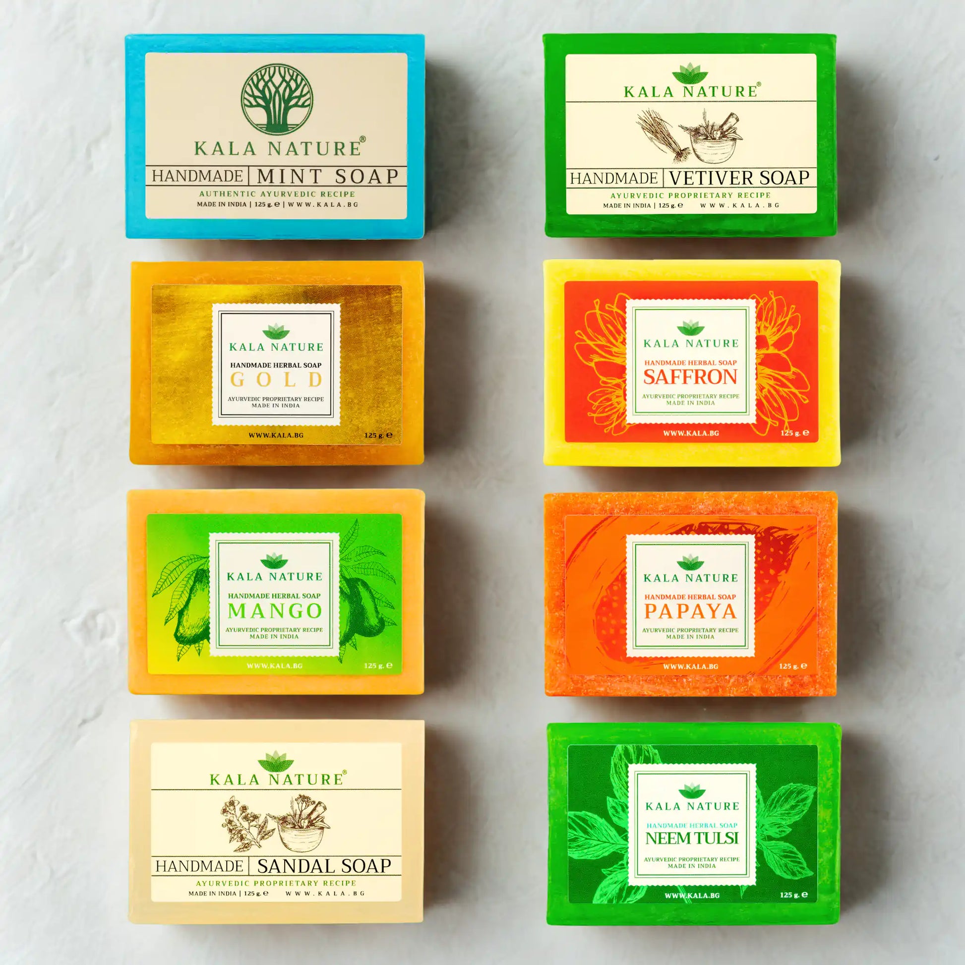 Комплектът съдържа 8 различни аюрведични сапуна: Нийм и Тулси, Шафран, Ветивер, Манго, Папая, Сандалово дърво, Мента и Злато – всеки с уникално действие и аромат.